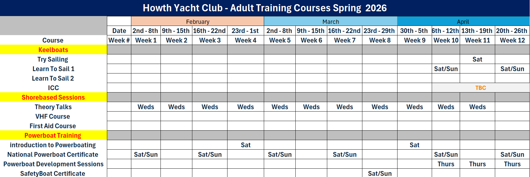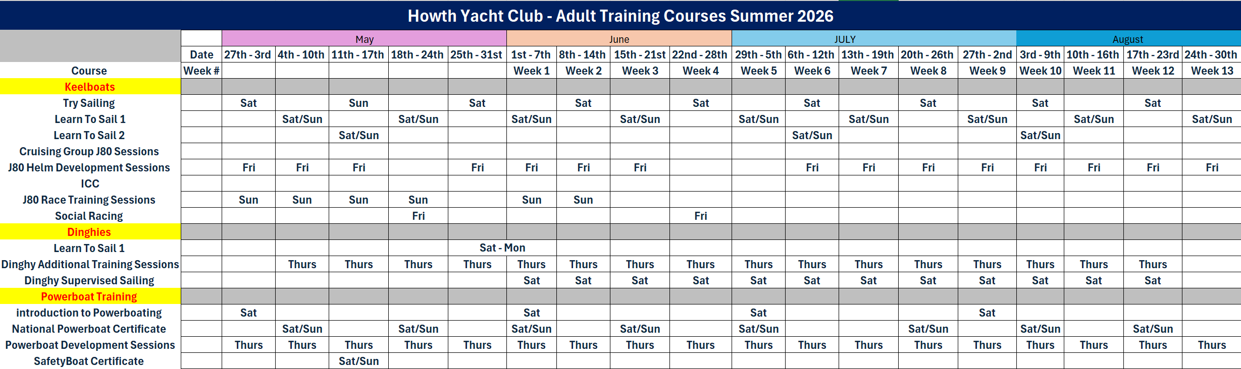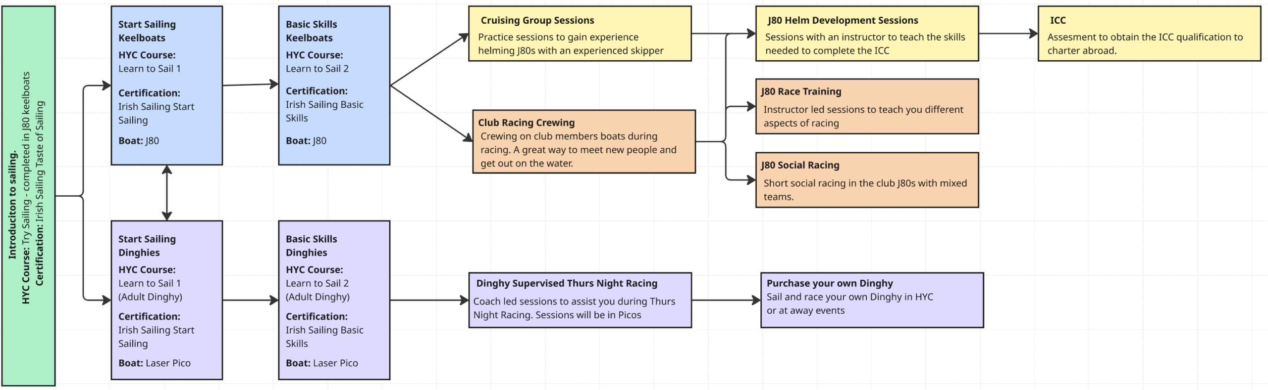 Discover the excitement and lifelong joy of sailing at Howth Yacht Club. There are many ways to begin your sailing journey or further develop your skills, while enjoying time on the water and connecting with other sailors. All courses are led by qualified Irish Sailing instructors and take place in the safe, sheltered waters around Howth and Ireland’s Eye. Explore our Spring and Summer schedules, along with our sailor progression pathway, below — and join us on the water.